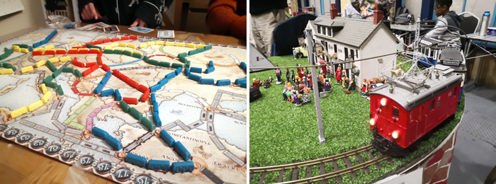 А с сыном – съездили на выставку моделек железных дорог. Продолжая паровозную тематику, подсели всей семьей на настолку Ticket to Ride.