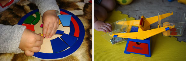На первом фото – из кусочков составляем круг (GoKi Wooden Mosaic Circle Puzzle). Есть ещё у нас модификация попроще, где из кусочков надо складывать пиццу. На втором фото – весы с грузиками (в продаже есть куча разных разновидностей под названием balance weights или scale), на которых в перспективе дети должны учиться складывать-вычитать, а пока отрабатываем знак равенства :) (взвешиваем игрушечные машинки и т.п.):