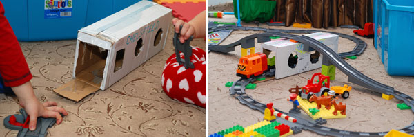 Многие вещи пытаемся делать сами, чтобы немного развивать воображение – например, недавно из ненужной коробки образовался туннель для лего-поездов (ещё похожий туннель делали для обычных машинок, игрушечный картонный домик для Ники и т.д.):